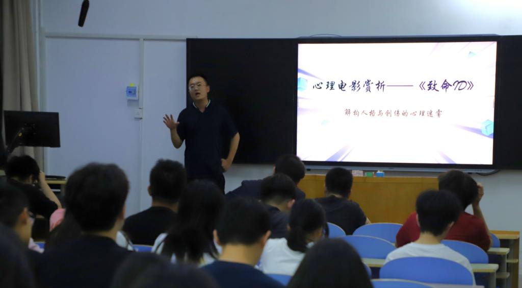 电影赏析环节,孙斌从心理学的角度,带领同学们剖析剧中人物的心理活动与行为表现,拨开人格与创伤的心理迷雾,解读不同人格如何映射人类本能欲望、现实理性与道德约束,引发大家对人性复杂性的深入思考。每个人内心都有不同的“人格”,学会接纳和平衡它们,对保持心理健康至关重要。在互动交流中,孙斌还结合电影情节,深入浅出地讲解了人格心理学、创伤后应激障碍等专业知识,并提供了在日常生活中进行自我心理调适的方法,帮助同学们将电影中的心理学知识转化为自我关怀的实际行动。